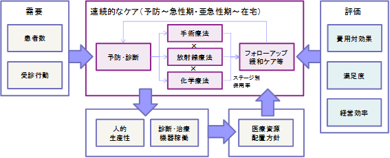 地域医療構想や医療計画の策定手法の方向性として、地域や疾病単位で、罹患率、入院経路、医療機能ごとの資源投入量、患者の流出入を把握し、ベストプラクティス(あるべき診療プロセス)をベンチマークとして、必要医療資源を試算する方法が開発されるのではないか=図=。