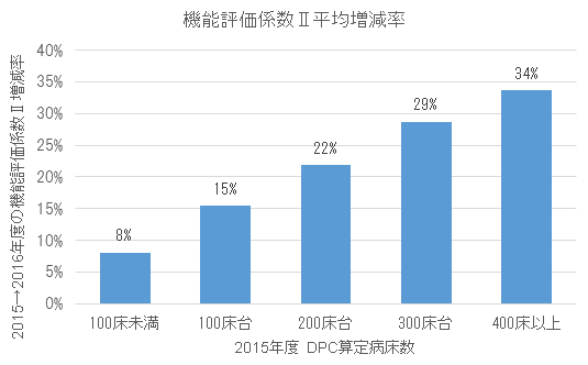 5月下旬の診療報酬調査専門組織「DPC評価分科会」では、2016年度の各病院の機能評価係数Ⅱの内訳が公表された。その結果、カバー率係数の算定方法の見直しにより、DPC病院Ⅲ群の場合、大病院ほど恩恵を受けたことが明らかとなった。まさしくふた昔前の病院経営セオリーである「大きいことはいいことだ」となる。