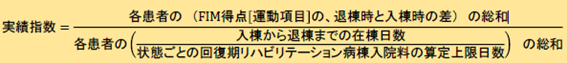 アウトカム評価のための実績指数=図=は、「FIM運動項目の改善度合い」と「入院日数」から成るが、指数をアップさせるには、分子のFIM利得(退棟時と入棟時のFIM運動項目の点数差)を上げるか、分母の入院期間を短縮するしかない。今回はこの2つの要素について考えたい。