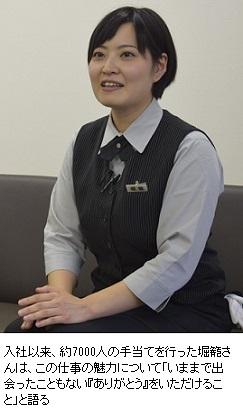 ケアサービスのエンゼルケア事業で勤務し、今年で入社7年目となる堀籠夏紀さんは、これまでに約7000人の手当てを行ってきた。手当てとはエンゼルケアサービスの一環として、病気や事故によって、見た目が変わってしまった故人をメイクなどで生前の姿に近づける作業を指す。入社前には専門学校で特殊メイクの技術を学んだという堀籠さんだが、彼女の手当てが、ある女性とその両親との別れの形を変えたことがあった。