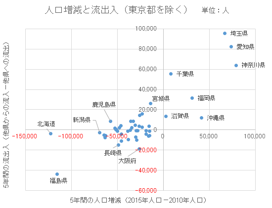 また、人口が減少している道府県では、宮城のように流入が多い県や、大阪、長崎、福島のように流出が多い府県もある。