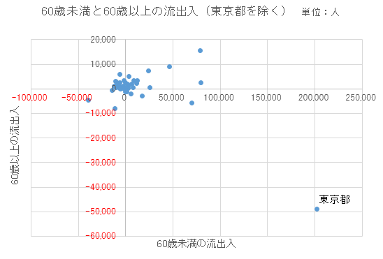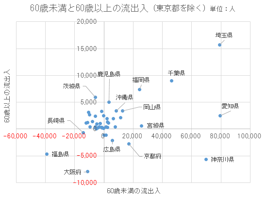 さらに人口流出入について、60歳未満と60歳以上に分けプロットした=グラフ3=。埼玉は60歳未満・60歳以上とも流入している一方で、神奈川は60歳以上が流出している。また茨城では60歳未満が流出、60歳以上が流入している。東京については=グラフ4=、60歳未満が大幅に流入している一方で、60歳以上は流出している。