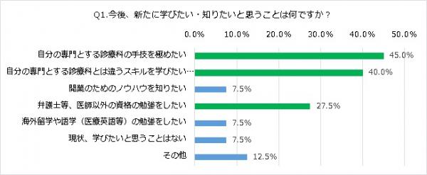 CBnewsでは今年6月20日から29日にかけて、日本国内で働く医師を対象にキャリアに関するアンケート調査を実施。40人から有効回答を得た。 今後、新たに学びたい・知りたいと思うことについて、複数回答で尋ねた質問で、最も多かったのは「自分の専門とする診療科の手技を極めたい」の18件(45.0%)で、次いで多かったのが、自分の専門とする診療科とは違うスキルを学びたい(転科・訪問診療など)の16件(40.0%)だった。さらに「弁護士など、医師以外の資格の勉強をしたい」と答えた人も11人(27.5%)いた。「現状、学びたいと思うことはない」と答えた人は3人(7.5%)にとどまった= グラフ =。 ■学びの意欲、「在宅」での活動が背景に 学びたい理由について自由回答形式で尋ねた質問では、「2025年問題を考えて在宅緩和医療が必要になると思われるから」(60歳代男性)「訪問診療は今までの枠にはまらないため」(40歳代男性)など、在宅分野への活動を広げるため新たな知識や技術を得たいとする回答が複数見られた。そのほか、「初期症状に幅広く対応したい」(60歳代男性)や「医療以外の知識が、医療をより良いものにする為に必要と思うから」(60歳代女性)といった回答も寄せられた。