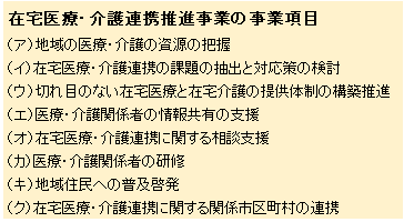 この事業は、市区町村が、郡市医師会などと協力し、地域の在宅医療・介護の連携を促していくもので、厚生労働省医政局の施策を引き継いでいる。