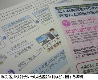 厚生労働省の医療情報の提供内容等のあり方に関する検討会は7日、医療機関のウェブサイトの監視や規制に関する取りまとめ案を大筋で了承した。虚偽・誇大表示を対象にした新たな規制を設けることや、ネットパトロールを実施する必要性を挙げている。厚労省は、懲役・罰金刑も視野に入れて検討し、来年の通常国会に規制を盛り込んだ医療法の改正案を提出する見通し。【新井哉】