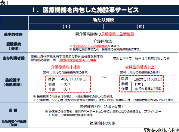 介護療養病床のうち、療養機能強化型Aと同Bの利用者らが対象となる「医療内包型」の「I型」では、人員配置などの最低基準を現行の介護療養病床と同程度とした。一方、介護療養病床の「その他」の利用者など、容体が比較的安定した人を主な対象と位置付ける「Ⅱ型」では、人員配置基準などを介護老人保健施設(老健)の基準以上とした=表1=。