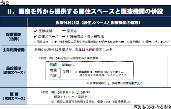 26日の会合で厚労省は、介護保険法に基づく新類型である「医療内包型」と、介護保険法に基づく既存の類型と医療機関を併設させた上で、運用上の特例を設けたり、各種の要件を緩和したりする「医療外付型」とで、計3パターンの案を示した。