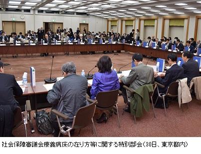 厚生労働省は30日、社会保障審議会の「療養病床の在り方等に関する特別部会」(部会長=遠藤久夫・学習院大経済学部教授)に、同部会の議論の取りまとめに向けた整理案を示した。案では2017年度末で設置期限を迎える介護療養型医療施設(介護療養病床)などの転換先と位置付けられた新類型について、療養病床以外から新規参入を認める方針が示されている。この提案に対し委員の多くからは、新類型への参入については介護療養病床や医療療養病床からの転換を優先させるべきとの意見が上がった一方、将来的な新規参入の必要性には理解を示す声も相次いだ。【ただ正芳】