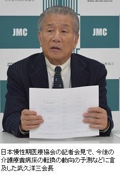そんな状況にあって「多くの介護療養病床は、新たな施設と位置付けられた新類型に移る」と予測するのが、日本慢性期医療協会の武久洋三会長だ。「病院から施設になったとしても、患者さんの状態を改善し、自宅や地域に帰していく役目は変わらない」と力説する武久会長に、その考えや今後の制度改正の見通しを聞いた。【ただ正芳】