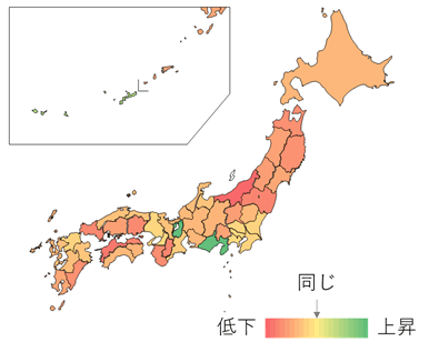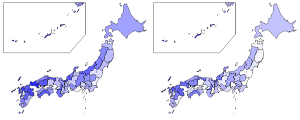 左右の地図は同じ基準で塗り分けている。左の日本列島の色は濃く、右は薄い。日本全体で病床利用率が低下していることが見えてくる。病床利用率の低下に極端な地域差、偏りは見られないことから、高齢化の進展度合いや疾患構成の差異等の影響以上に、全国一律で課せられる診療報酬改定等への対応による影響が大きいのかもしれない。