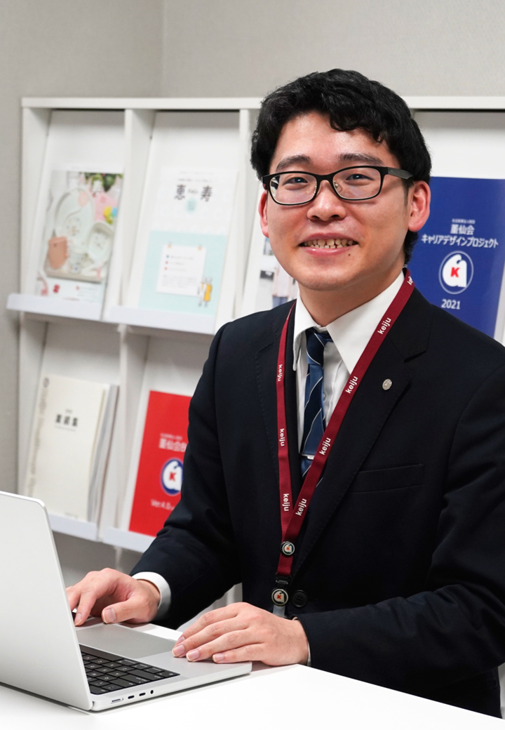 1995年島根県生まれ。富山大学芸術文化学部デザイン情報コース卒。20年に董仙会に新卒で入職。入職後は大学時代の自分中心のデザインと、実際に仕事として行うデザインとの乖離を痛感する。チーフデザインオフィサーである常務理事より「自分のやりたいデザインではなく、相手が実現したいことや、言葉になっていないことを引き出し、要望を120%叶えるデザインをすること」「ディテールに溺れるのではなく、まずはコンセプト・ストラクチャーを確立すること」などを日々学ぶ。現在は主に動画制作を担当し、病院の検査説明や体操の動画などを制作。